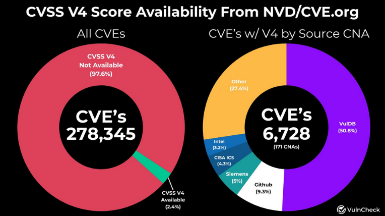 CVSSv4 progress: According to VulnCheck researcher Patrick Garrity, only 2.4% of all CVEs have a CVSSv4 score 1.5 years after the standard passed. Around 1.2% of those scores are from one CNA, so it's safe to say the standard is dead right now.