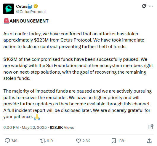 Cetus Protocol crypto-heist: Hackers have stolen $223 million worth of crypto tokens from the Cetus decentralized exchange. The attackers exploited vulnerabilities in several smart contracts that managed the platform's asset liquidity pools. Cetus says it worked with industry partners and has already frozen $162 million of the stolen assets.