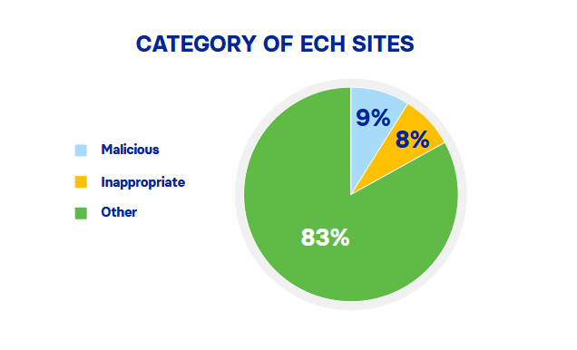 ECH adoption remains low: A Corrata report found that less than 0.01% of TLS connections used the ECH protocol and that ~17% of these ECH-enabled sites were considered suspicious.