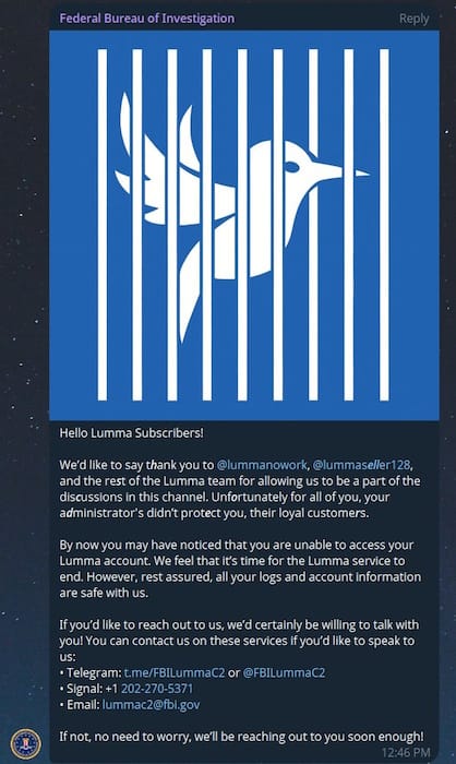 Authorities didn't specify if they seized servers and backend databases, but according to a message the FBI allegedly posted in Lumma's private Telegram channel, the Bureau does appear to have the servers and data on Lumma customer data as well.