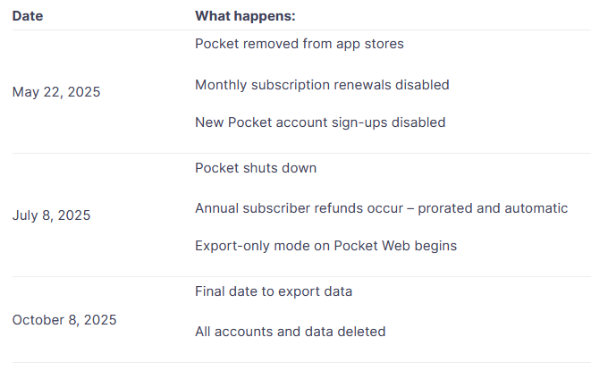 Mozilla to shut down Pocket: Mozilla will shut down its read-it-later URL saving service Pocket on July 8.