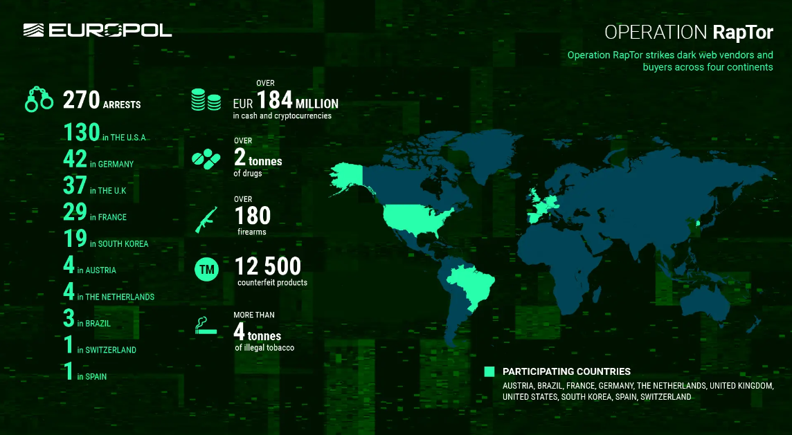 Operation RapTor: Law enforcement agencies across the world have arrested 270 suspects who sold illegal products on the dark web. The suspects were identified using data seized from dark web marketplaces Nemesis, Tor2Door, Bohemia, and Kingdom Markets. Almost half were based in the US. Authorities also seized over €184 million in cash and cryptocurrencies.