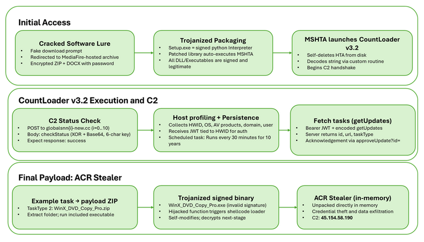 CountLoader: Cyderes has spotted a new version of CountLoader being used in the wild to deploy the ACR Stealer.
