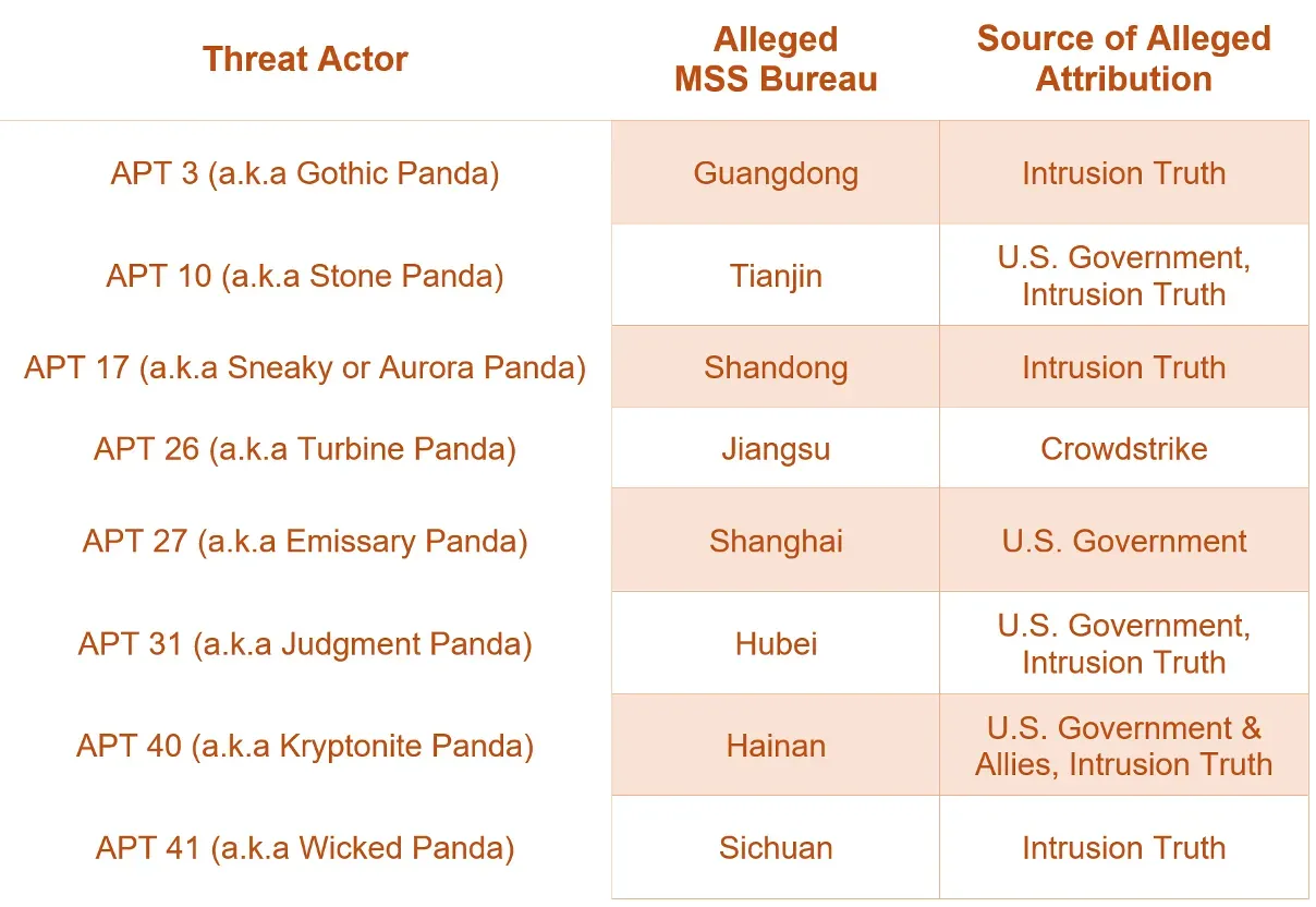 Chinese APTs and their MSS bureaus: Natto Thoughts has assembled some historic research and linked some of the major Chinese APTs to their respective regional MSS bureaus.