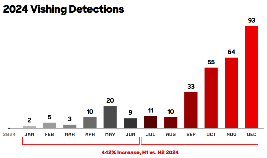 Vishing activity exploded in 2024: Voice phishing (vishing) attacks saw explosive growth and grew by 442% last year, according to CrowdStrike's yearly threat report. The technique saw increased adoption over the last four months of 2024. It is widely used to deploy backdoors or remote access tools on enterprise networks. These tools are then used to enable or deploy ransomware. It is now widely used by e-crime groups across China and Russia, such as Chatty Spider, Plump Spider, and Curly Spider.