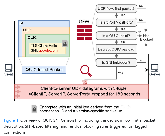 China is now censoring QUIC traffic: The Chinese government has started filtering and censoring internet traffic taking place over the QUIC protocol. According to a team of academics, the filtering started in April last year. The Great Firewall decrypts QUIC packets at scale and uses a separate blocklist for QUIC traffic, separate from its main filters.