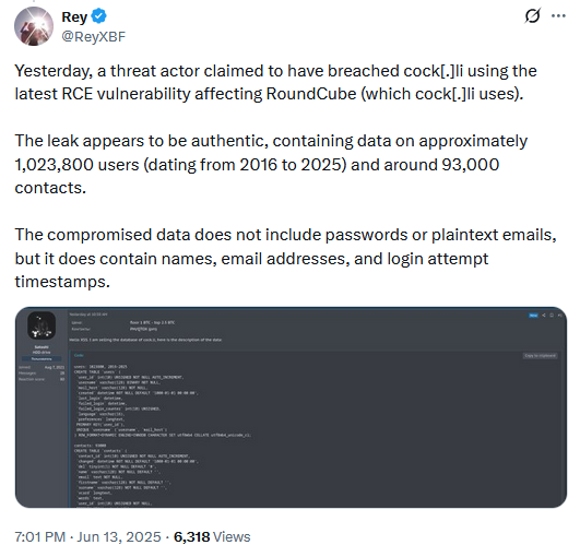 The hacker allegedly used a recently disclosed zero-day in the Roundcube webmail software (CVE-2025-49113) to dump Cock[.]li's database and steal the details of over one million registered users.