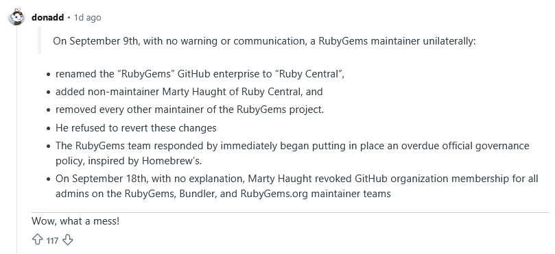 RubyGems takeover: The Ruby Central team has taken over the RubyGems package repository from its current maintainers and revoked everyone's access. Ruby Central says that going forward, "only engineers employed or contracted by Ruby Central will hold administrative permissions" over RubyGems. [Additional coverage in Seuros, Andre Arko, Pup-e/PDF]