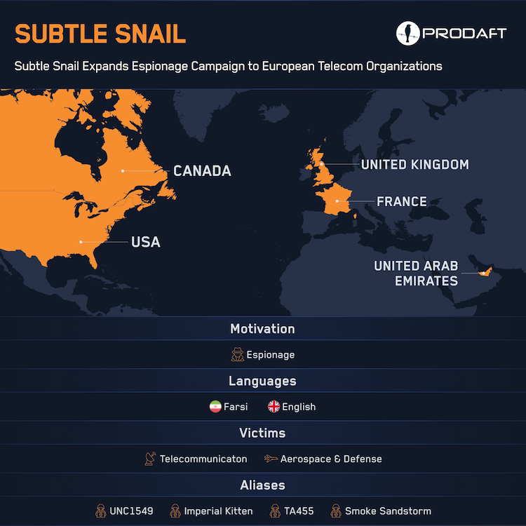 Subtle Snail (UNC1549): An Iranian cyber-espionage group is using fake LinkedIn jobs to target employees of EU telcos and defense organizations. According to security firm Prodaft, one of the group's most recent campaigns has infected 34 devices across 11 organizations. Prodaft linked the attacks to a group it tracks as Subtle Snail. The group has been active since at least June 2022 and is believed to be a smaller cluster inside the larger Charming Kitten operation.
