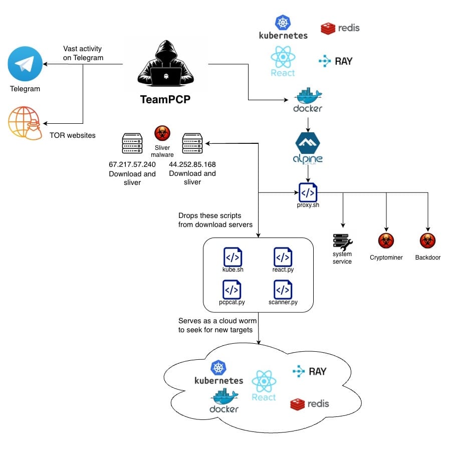 TeamPCP targets the clouds: A newly observed cybercrime group launched a massive hacking campaign targeting cloud environments. Starting with November of last year, TeamPCP (PCPcat, ShellForce, PersyPCP, DeadCatx3) compromised cloud environments to steal data for future extortions and deploy cryptominers. The attacks targeted misconfigured cloud technologies like Docker, Kubernetes, Ray dashboards, and Redis databases. Some of the stolen data is now being ransomed via public Telegram groups.