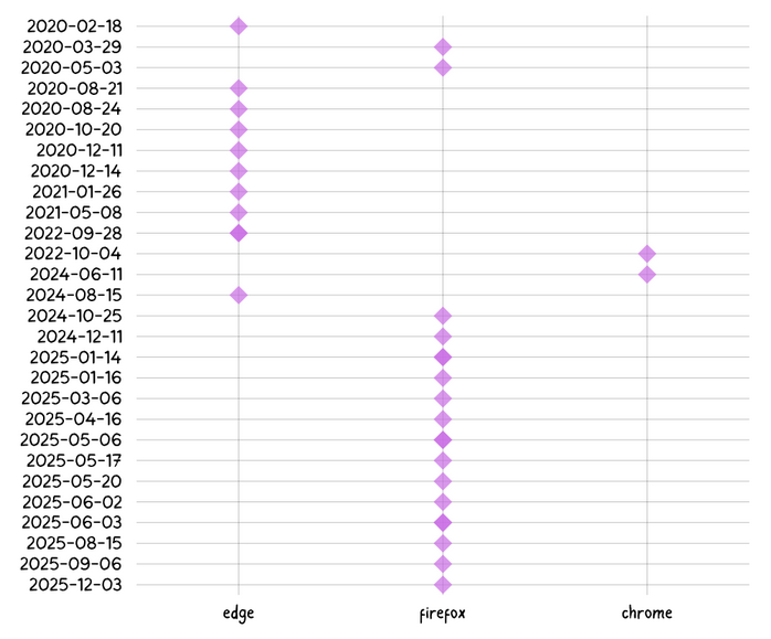 GhostPoster size doubles: Back in December, Koi Security discovered GhostPoster, a network of 17 malicious Firefox extensions. LayerX says it found an additional cluster of 17 more extensions, these ones also impacting Chrome and Edge. These new ones have an install base of over 840,000 users and some of them date back to 2020.