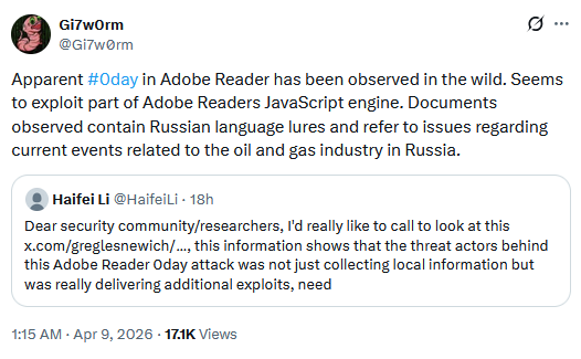 Adobe Reader zero-day: An Adobe Reader zero-day has been exploited in the wild since at least November. The attacks used lures related to Russia's oil and gas sector. No formal attribution, CVE, or patch are available. [SecurityWeek]