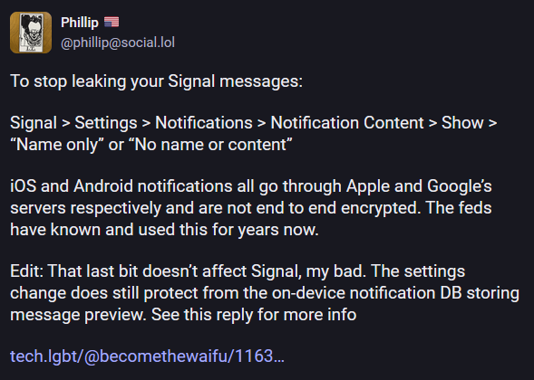 FBI extracted Signal chats from phone's noti log: The FBI has extracted past Signal messages from a suspect's device after they deleted the app. The data was extracted from an iPhone's database of past notifications. The new data extraction technique was used in a case related to anti-ICE protests in Texas. [404 Media]