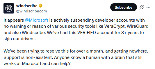 Microsoft suspends VeraCrypt, WireGuard, and Windscribe dev accounts: Microsoft has suspended the developer accounts of three major software makers. VeraCrypt, WireGuard, and Windscribe have not been able to sign drivers and ship updates for at least a week. Microsoft started a mandatory account verification process for all developers in the Windows Hardware Program last year. The verification process ended last month, when developers received their suspensions. After the issue gained attention in the tech press this week, the VeraCrypt and Windscribe developers said someone at Microsoft reached out and this was being handled. [TechCrunch]
