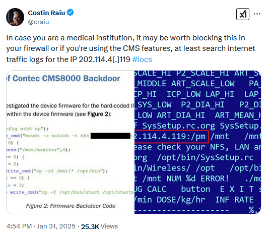 The US government warns that Contec patient monitors contain a backdoor that collects and sends patient data to a remote Chinese IP address and can even secretly download and execute files.