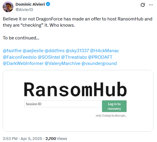 DragonForce strikes again: The DragonForce ransomware group has hacked another one of its competitors, the RansomHub RaaS. This is their third victim after previously also hacking Mamona and BlackLock.