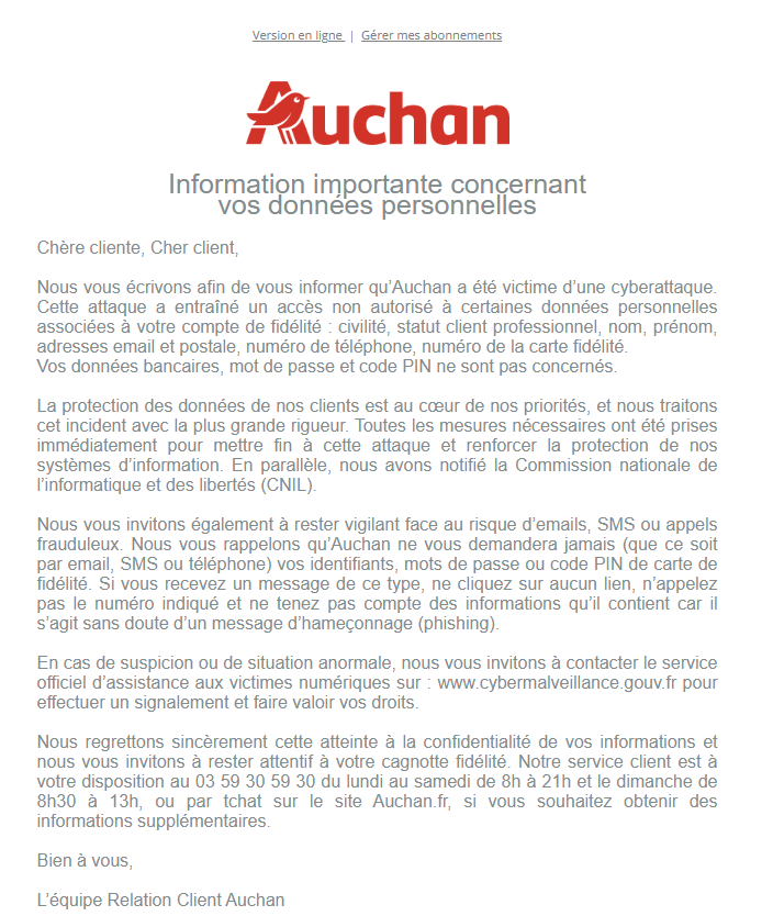 Auchan leak: Supermarket chain Auchan has notified French customers of a security breach of its loyalty card system. The company disabled cards to prevent abuse. Customers were asked to visit stores to receive new ones. This is the company's second security breach after a first incident in November last year. [Additional coverage in Zataz/English coverage in Entrevue]