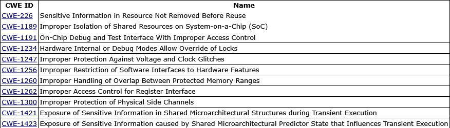 MITRE updates CWE MIHW list: MITRE has updated the list of most important hardware weaknesses. The new list is below.