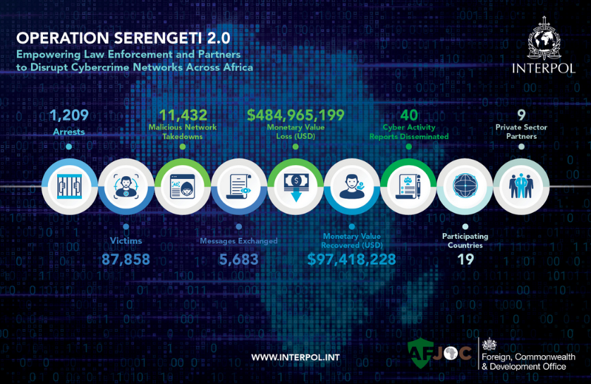 Operation Serengeti 2.0: Law enforcement agencies from 18 African countries have arrested over 1,200 cybercrime suspects. The individuals were allegedly involved with online scams, BEC, and ransomware attacks. Authorities dismantled cryptomining centres, seized domains and forged documents, and recovered $97 million in stolen assets. The arrests were part of Operation Serengeti 2.0.