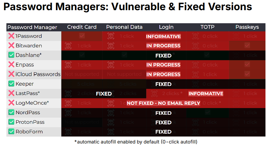 Clickjacking attack on password managers: Six major password managers are vulnerable to a clickjacking attack that can steal user data. The attack relies on luring users to malicious sites where the attackers can overlay their own UI over the password manager interface. Clicks on the fake interface actually interact with the password manager interface below it. Only five of eleven password managers deployed fixes. 1Password, Bitwarden, Enpass, iCloud Passwords, LastPass, and LogMeOnce remain vulnerable.