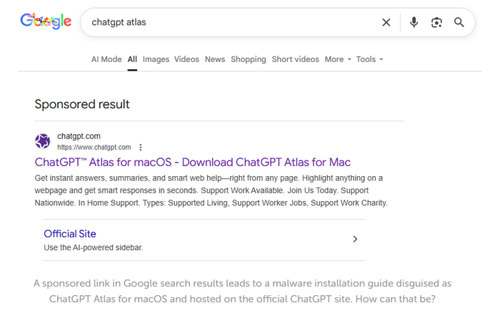 ChatGPT share link abuse: Threat actors are abusing the ChatGPT share chat feature to poison search results, posing as ChatGPT itself and luring users into installing versions of the OpenAI Atlas browser containing the AMOS macOS infostealer. [Kroll//Kaspersky]