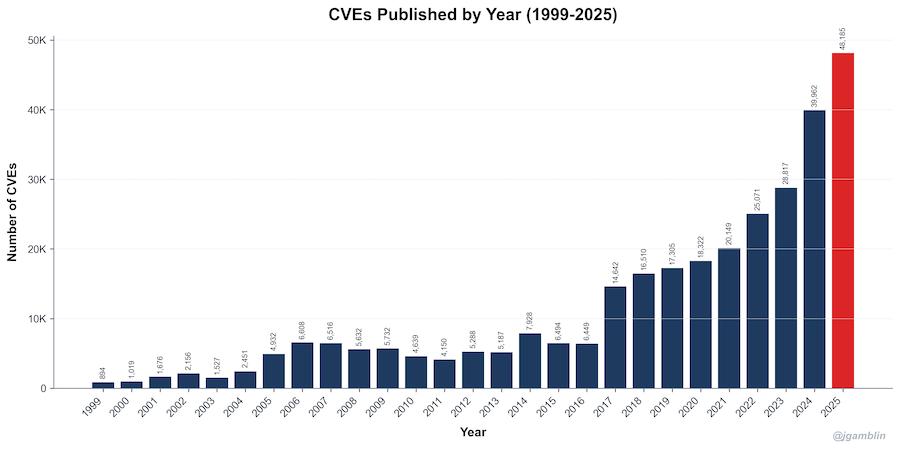 2025 vulnerabilities in review: More than 48,000 vulnerabilities were reported and received a CVE last year, up from the 39k reported in 2024. The Linux kernel saw the most vulnerabilities this year, followed by Windows 10 and Android. [Jerry Gamblin]
