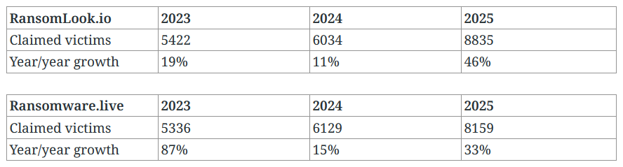 Ransomware had a massive year: According to Emsisoft, ransomware groups had a massive year claiming between 8,100 and 8,800 victims last year, between 33% and 46% growth from the previous year (depending on sources).