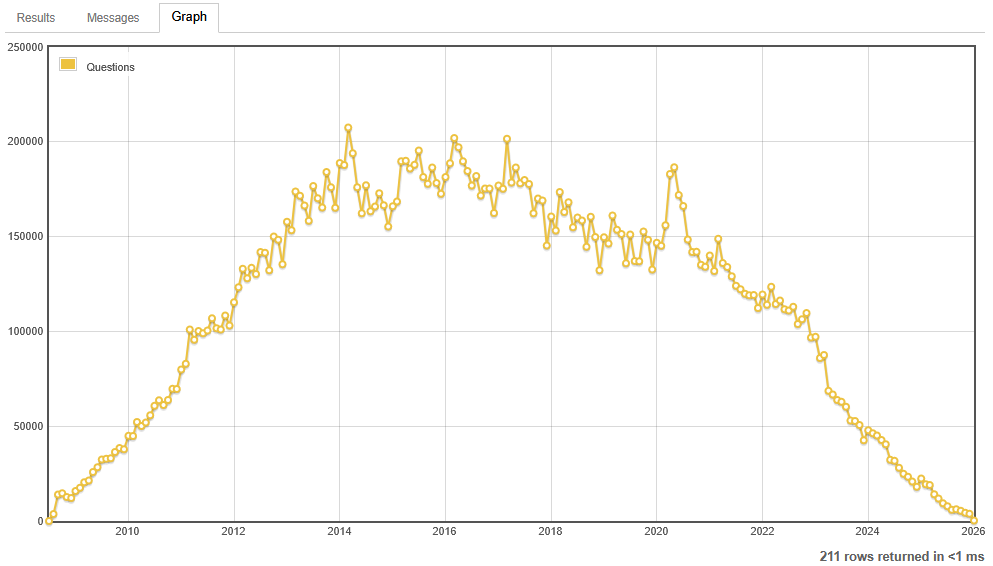 StackOverflow collapses: The number of monthly questions on Stack Overflow has collapsed from its peak of 207,000 in 2014 to just around 300 at the end of last year. The slow decline predates LLMs and chatbots, but appears to have been accelerated by them.