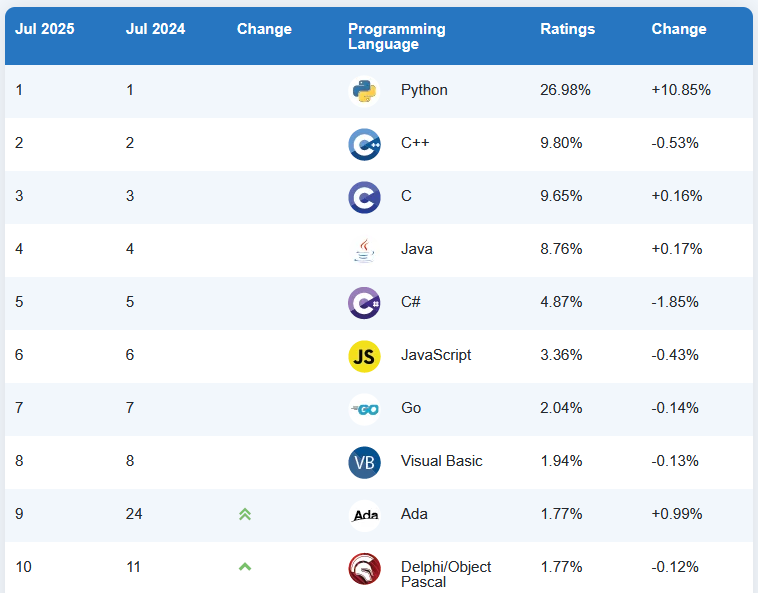Ada enters Top 10: The 45-year-old Ada programming language has entered the TIOBE Top 10 index of programming languages for the first time. Ada is #9, Delphi is #10, and Fortran is #12. The end is nigh!