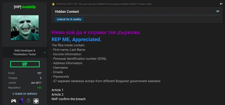 Bulgarian hacker sentenced to time served: A Bulgarian court has sentenced a local cybersecurity expert to a suspended nine-month sentence for hacking the country's tax agency. Kristiyan Boykov hacked the agency in 2019 while he was an employee of cybersecurity firm the TAD Group. Boykov leaked the database to reporters and was arrested a week later. The data later leaked on hacking forums and included the personal details of more than 5 million Bulgarians. [Additional coverage in BTA] [h/t DataBreaches.net]