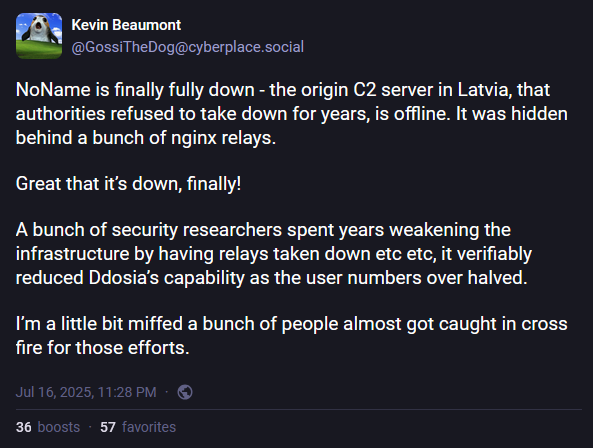 Europol disrupts NoName057(16): An international law enforcement operation has disrupted the activity of pro-Kremlin hacktivist group NoName057(16). Authorities seized over 100 servers, detained two members, and issued arrests for seven other individuals. The NoName057 launched after Russia's invasion of Ukraine and carried out thousands of DDoS attacks against Western countries. It used Telegram channels and a gamified experience to recruit new individuals to its cause. Authorities say they've identified more than 1,000 supporters and notified them of possible legal repercussions. [Press releases from Europol, Dutch police, Swedish police, Swiss police, German police]
