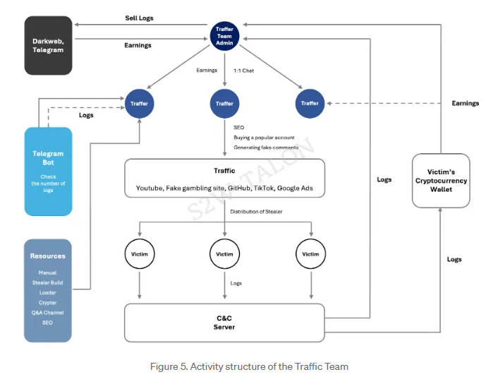 Traffer ecosystem: S2W has published a report on how the traffer ecosystem works with infostealer gangs to drive massive amounts of traffic to their malicious sites.