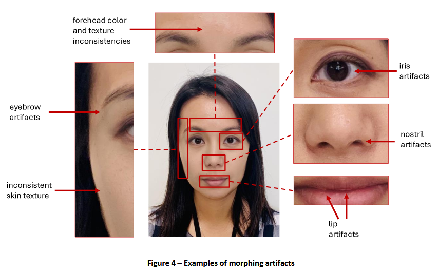 Detection tools look for artifacts left in the morphed photo by the morphing software, such as inconsistent skin texture, skin color, and unnatural-looking areas around the iris, nostrils, lips, and eyebrows.