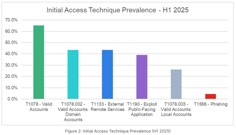 Valid accounts still rule the day: According to Fortinet's H1 IR report, valid/compromised accounts have remained the top entry vectors for most breaches this year.