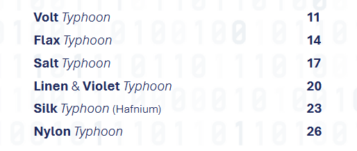 The Typhoons: The McCrary Institute at the University of Auburn has published a report on all the major Chinese APT groups, typically tracked under a [XXX] Typhoon code.