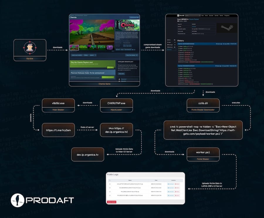 Steam malicious game: Security firm Prodaft has found three different malware strains (Fickle Stealer, HijackLoader, and Vidar) in the Chemia game on Steam.