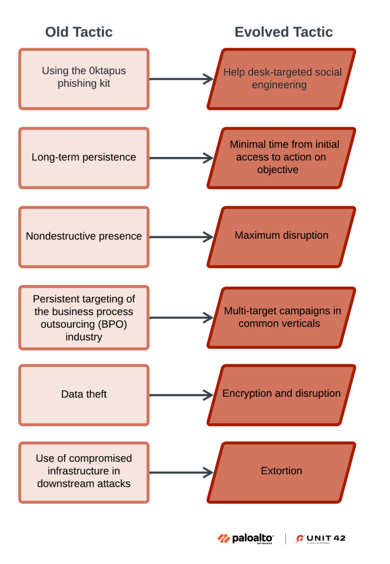 Muddled Libra profile: PAN's Unit42 has published a profile with updated TTPs from Muddled Libra (Scattered Spider) intrusions. Per the second graph below, they've certainly changed. This is because individuals who made up the Scattered Spider "group" back in 2023 have been arrested, and this is a new "batch" of APTeens.