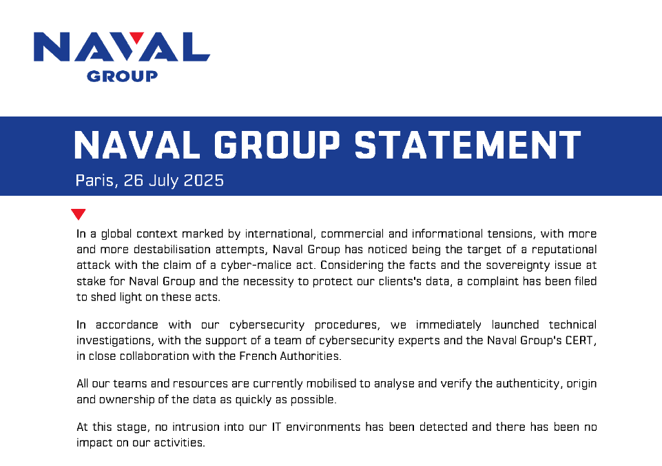 Hackers hit France's submarine maker: One of France's biggest defense companies is investigating a cybersecurity breach. The Naval Group has alerted security teams and French authorities after a hacker claimed to have stolen 1TB of data from its servers. The hacker claims the data was taken from a CMS linked to submarine and frigate production. The Naval Group is a state-owned shipmaker founded in the 1600s, currently responsible for building the country's ship and submarine fleet. [Additional coverage in The Telegraph] [h/t Ronin Dey]
