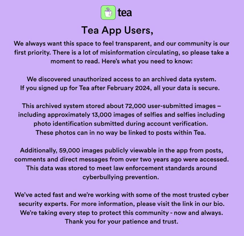 Tea app data hacked, leaked: Hackers have breached, stolen, and then leaked sensitive data from the Tea app. The data was allegedly stolen from an internet-exposed backup system. It included the details of more than 72,000 users and 13,000 unredacted photos of selfies and real-world IDs. The app allows women to share details of abusive men and discuss their dates. The hacker leaked the data on 4chan. The data was later used to create a map with the location of Tea users across the US. [Additional coverage in NBC News]