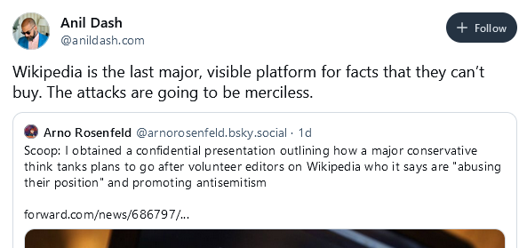 Wikipedia attacks: American right-wing think tank the Heritage Foundation, which produced Project 2025, plans to "identify and target" Wikipedia editors. The organization plans to use the guise of "antisemitism" to go after editors, but American right-wing figures like Trump and Musk have attacked the site for hosting information on some of their past actions they'd like expunged from the public record.