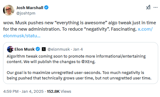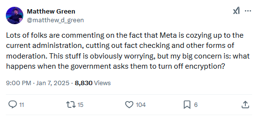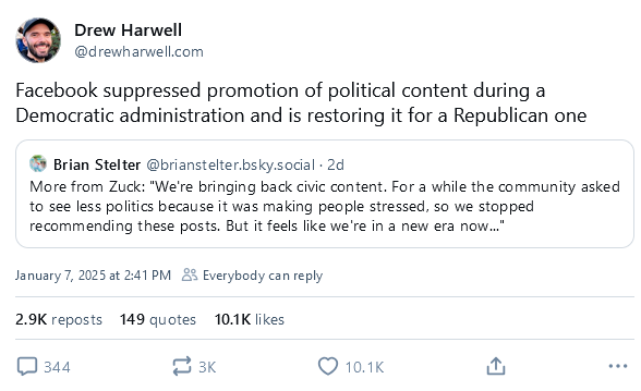 Meta ends fact-checking program: Meta has ended its fact-checking program and is introducing a Twitter-like community notes system. The company justified its move as restoring fReE sPeEcH. The company says it will also allow political content back on the platform and will also relax its moderation practices (aka allow harassment, if you need a translation). Meta says it will also move its moderation centers from California to Texas because of concerns that "biased employees are overly censoring content." Guess Trump threatening Zuckerberg with life in prison worked. I'm honestly surprised the Meta press release didn't encourage a military invasion of Greenland.