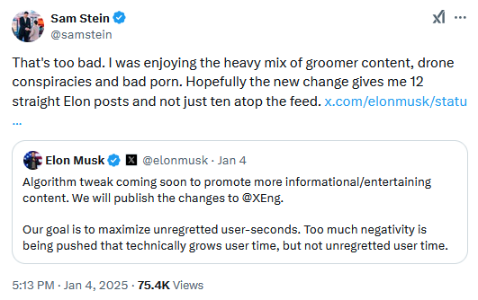 Twitter changes algorithm: Elon Musk says Twitter/X will change its algorithm to promote "informational/entertaining content," aka the stuff you usually find in automated meme accounts. The move comes after Twitter changed its algorithm last year, ahead of the 2024 global election cycle, to promote content from smaller accounts—aka troll farm accounts. Now that the elections are over, nobody needs to see "too much negativity" on the platform, as Musk put it.