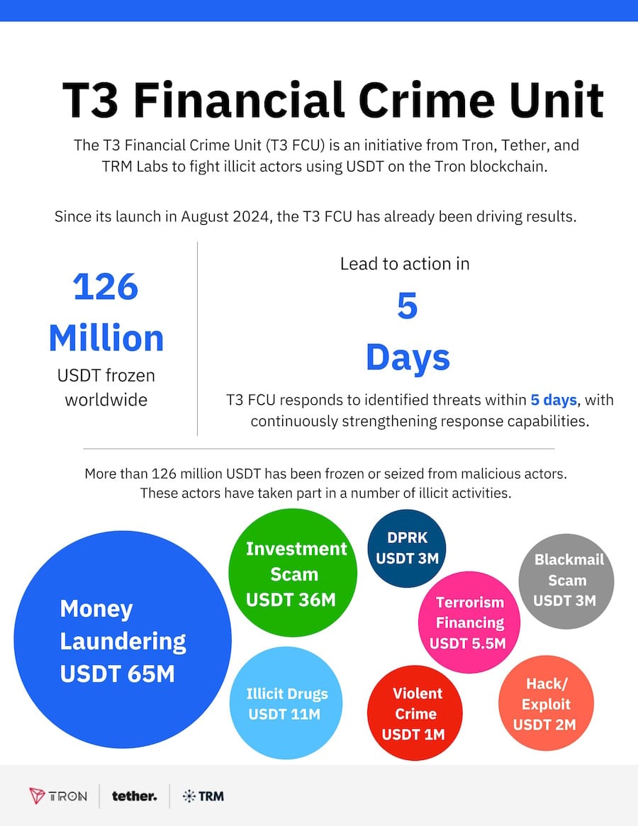 Crypto seizures last year: The T3 Financial Crime Unit, a collaboration between TRON, Tether, and TRM Labs, has frozen more than $126 million in criminal assets globally last year.