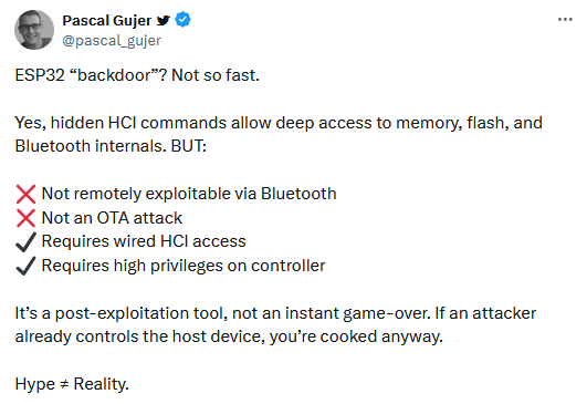 Espressif ESP32 undocumented commands: Security firm Tarlogic has discovered security flaws in Espressif ESP32 WiFi and Bluetooth chips. The chips contain hidden undocumented commands that can be abused by malware running on a device or via a wired connection. Tarlogic believes the undocumented commands may impact over one billion devices, such as phones, laptops, and IoT devices. The hidden commands cannot be exploited over-the-air, despite being in WiFi and Bluetooth chips. They appear to be part of some sort of production testing and development interface rather than backdoors.