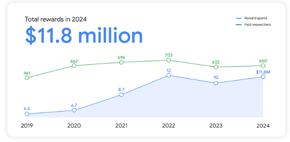 Google 2024 VRP: Google paid almost $12 million to security researchers last year for vulnerability reports across its products. The money went to 660 researchers, with the highest bounty last year being $110,000. Over half the money was paid out for Android ($3.3 million) and Chrome ($3.4 million) vulnerabilities. Since its inception in 2010, Google has paid over $65 million for vulnerability reports.