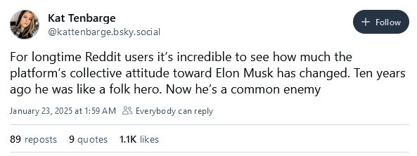 Reddit subs are banning Twitter links: Over 50 Reddit communities are now blocking users from posting Twitter links. Some have cited legitimate reasons, while others said the ban is a protest to Musk's Nazi salute during Trump's inauguration ceremony. [Additional coverage in NBC]