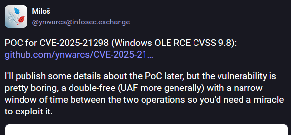 OLE RCE POC: Serbian security researcher Miloš has published a POC for CVE-2025-21298, a zero-click remote code execution in Windows OLE that can be exploited via malicious emails sent to Outlook inboxes. According to the researcher, attackers would "need a miracle to exploit it."