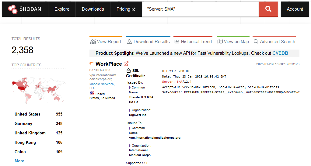 New SonicWall SMA zero-day: SonicWall has released a security update to patch an actively exploited zero-day in its SMA1000 security gateways. Tracked as CVE-2025-23006, the zero-day is a pre-authentication deserialization attack that can run malicious commands on the device's underlying OS. The zero-day has a severity rating of 9.8 out of 10. Over 2,300 SonicWall SMA appliances are currently exposed on the internet and vulnerable to attacks.