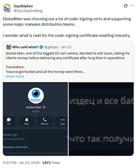 Global Man exit scams: An underground cybercrime service that sold code-signing certificates has exit-scammed. The certificates were used by multiple malware operations to sign their payloads. The Global Man team claims the service's source code was compromised. Funds deposited by customers in the service have also disappeared.