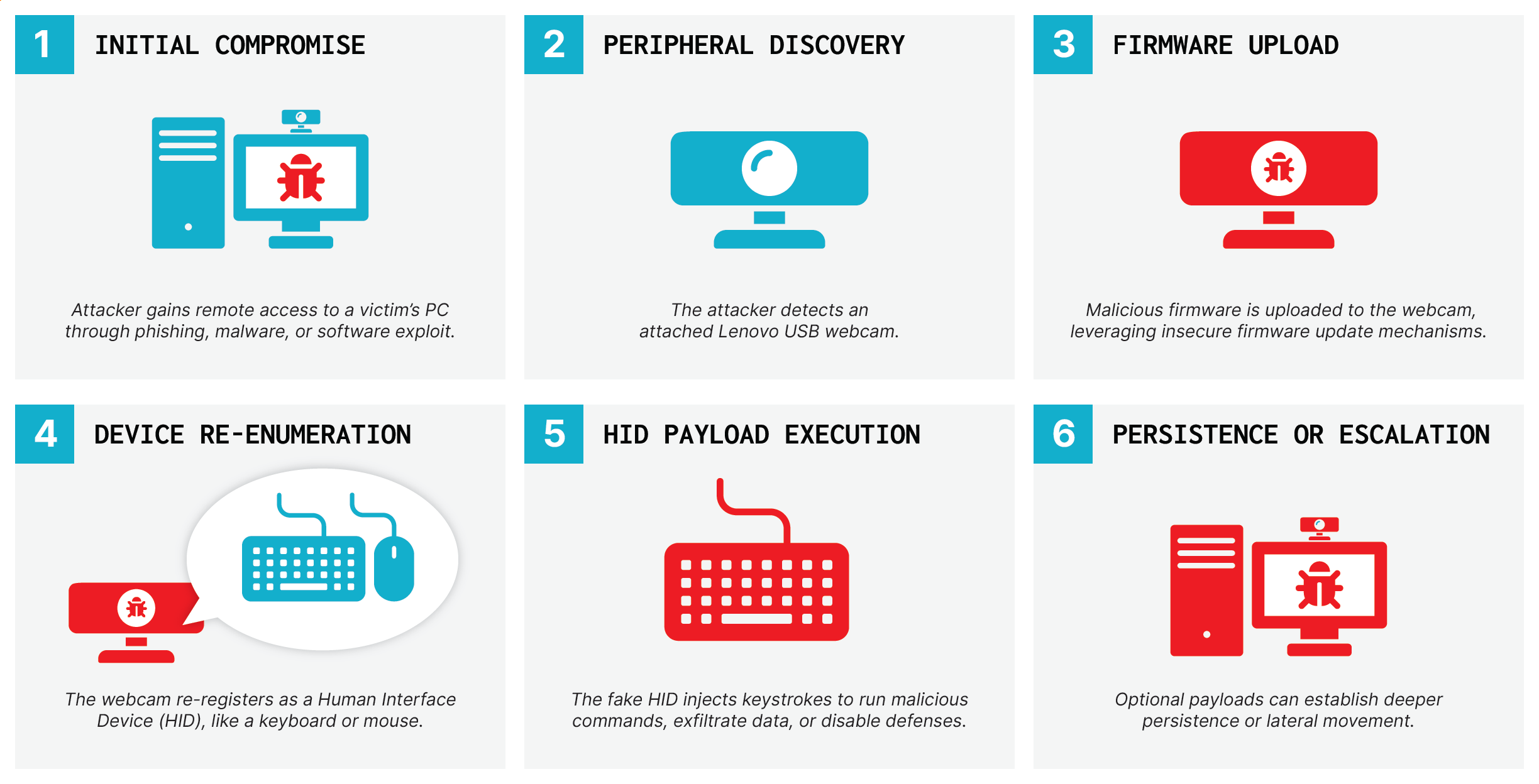 Webcams turned into BadUSB devices: Eclypsium researchers have developed BadCam, an attack that hijacks the firmware of Lenovo Linux-based webcams to turn them into classic BadUSB devices that can pose as a local keyboard and inject malicious keystrokes.
